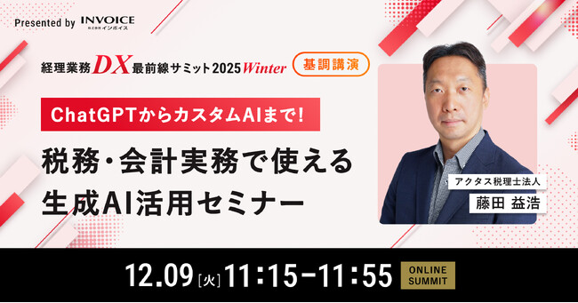 この度、株式会社インボイス(本社:東京都千代田区、代表取締役社長:仁多見 斎、以下「インボイス」)は、2025年12月9日(火)に開催する無料オンラインカンファレンス【経理業務DX最前線サミット 2025 Winter ~次世代の経理へ デジタルとAIによる業務プロセス改革13選~】へアクタス税理士法人(代表:粕谷 直人 本社:東京都港区)の藤田 益浩氏の登壇が決定したことをお知らせいたします。
