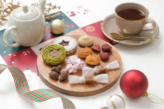 ピスタチオやラズベリーを使った季節のクッキー、スパイスを効かせた焼き菓子、冬に人気の濃厚ナッツ、そしてカカオハスクとスパイス香るオリジナルクリスマスティーなど、バラエティ豊かな8種のおやつと紅茶を詰め合わせました。