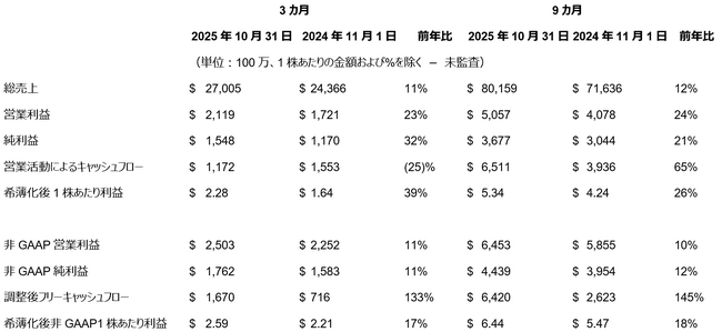 - 希薄化後1株あたり利益は前年同期比39%増の2.28ドル、非GAAPベースの希薄化後1株あたり利益は前年同期比17%増で第3四半期として過去最高の2.59ドル