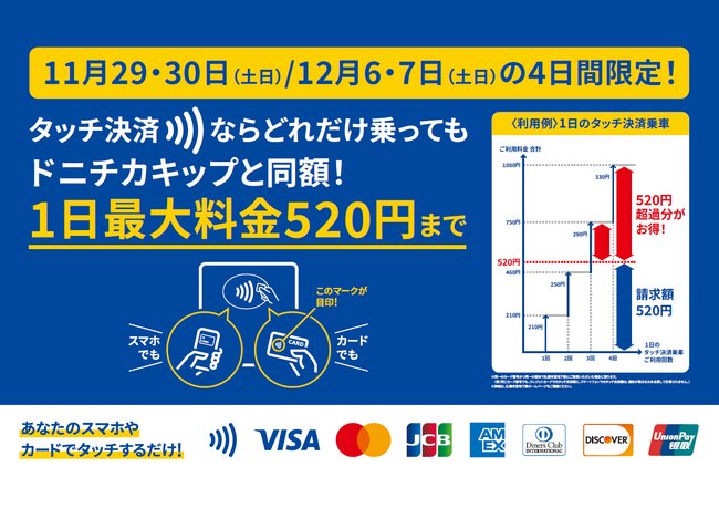 札幌市交通局では、令和7年11月29日(土)、30日(日)、12月6日(土)、7日(日)の4日間限定で、クレジットカード等のタッチ決済で地下鉄をご乗車いただいた場合に限り、1日の乗車料金が520円を超えた場合でも自動的に520円(ドニチカキップ相当額)となるキャンペーンを実施します。