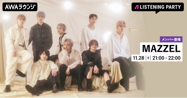 AWA株式会社(本社:東京都港区、代表取締役CEO:冨樫晃己)が運営する、サブスクリプション型(定額制)音楽ストリーミングサービス「AWA(アワ)」は、2025年11月28日(金) 21:00~22:00にて、無料で誰でも参加できるオンライン空間「ラウンジ」で、MAZZELのメンバーが音声とチャットで登場するリスニングパーティーを開催いたします。