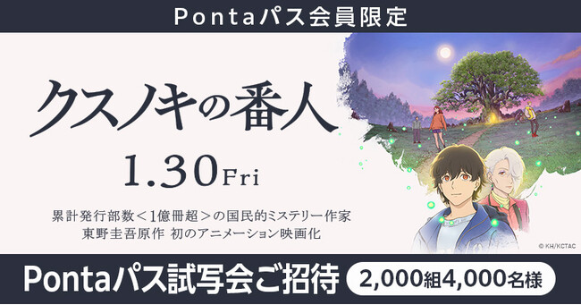 KDDIは、約1,500万人が利用しているおトクなサブスクリプションサービス「Pontaパス」(月額548円)会員の特典として、2026年1月15日に全国のTOHOシネマズにて開催予定の映画『クスノキの番人』(2026年1月30日公開)試写会に、2,000組4,000名さまを招待します。Pontaパス継続会員なら、試写会への当選確率があがります(※)。なお、同作品は推しトク映画対象作品として、Pontaパス会員ならいつでも指定の劇場にて1,100円でご鑑賞いただけます。
