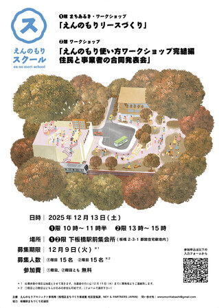 第5回「えんのもりスクール」では、板橋駅西口周辺エリアをまちあるきをしながらみどりを探して、見つけたみどりを使ってクリスマスリースを制作するワークショップや、えんのもりスクールの完結編として今までのワークショップの成果の実現に向けた板橋口・西口の再開発事業者との合同発表会を行います。