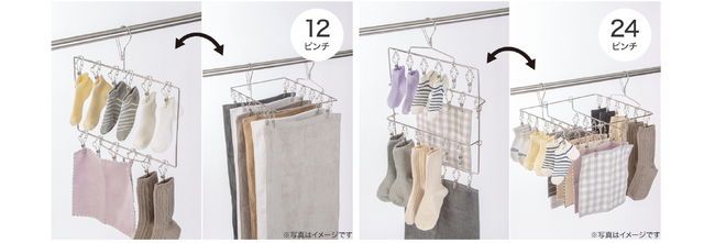 今回発売する「縦でも横でも干せるステンレスハンガー」は、縦向きにも横向きにも吊るすことができ、省スペースで多くの小物を一度に干せる設計です。