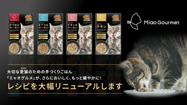 愛犬愛猫向けの手づくりごはんブランド「CoCo Gourmet(以下、ココグルメ)」「Miao Gourmet(以下、ミャオグルメ)」、愛猫向けピューレおやつ「にゃっち」を展開する株式会社バイオフィリア(本社:東京都新宿区、代表取締役:岩橋洸太、以下:当社)は、お客さまからいただいた貴重なご意見や、よりネコちゃんの健康にこだわり、「ミャオグルメ」のレシピを大幅にリニューアルいたします。