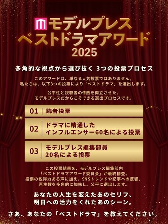 この投票結果を、モデルプレス編集部内「ベストドラマアワード委員会」が最終精査。投票の説得力ある声に加え、SNSトレンドや記事への反響、再生数を多角的に加味し、公平に選出します。