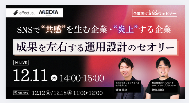 株式会社エフェクチュアル(本社:東京都港区、代表取締役:田中倫明)は、株式会社メディアエイドと共催で広報・マーケティング・ブランド担当者向けオンラインセミナー「SNSで“共感”を生む企業、“炎上”する企業 ─ 成果を左右する運用設計のセオリー」を2025年12月11日(木)11:00より開催いたします(参加費無料)。