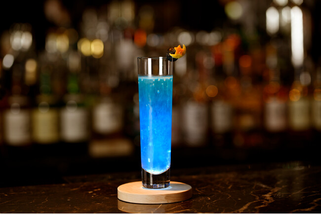 世界的に人気のあるイギリス産のプレミアムジンとして愛されている美しいブルーが目を引くボンベイサファイヤをベースに、シャンパンやパッションフルーツ、ライムなど、華やかでありながら爽やかな調和のとれた味わいが魅力のオリジナルカクテルです。綺麗なブルーのグラスの中にはアラザンでイルミネーションの輝きを表現、月と星を飾り、夜の横浜に酔いしれる魅惑の一杯に仕上げました。落ち着いた雰囲気の店内に静かに流れる大人の時間が大切な方とのひとときをロマンティックに彩ります。