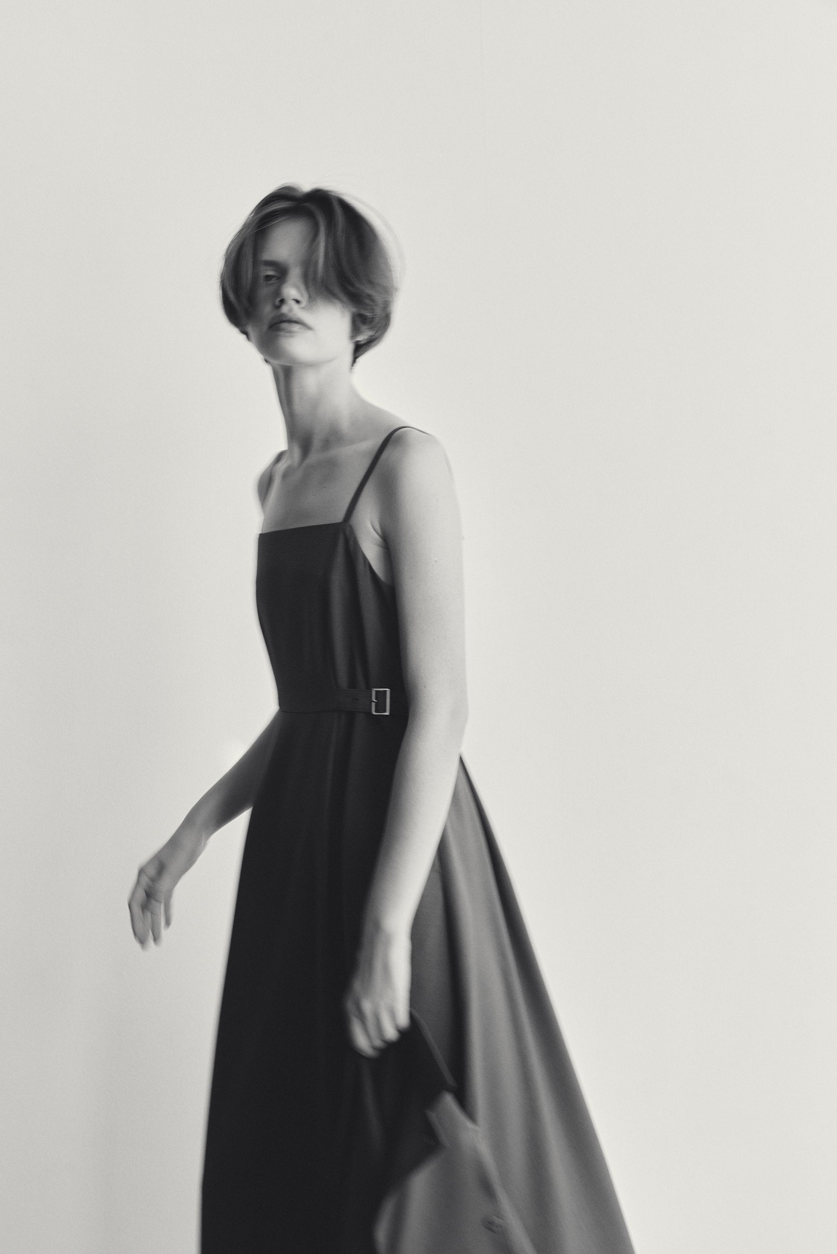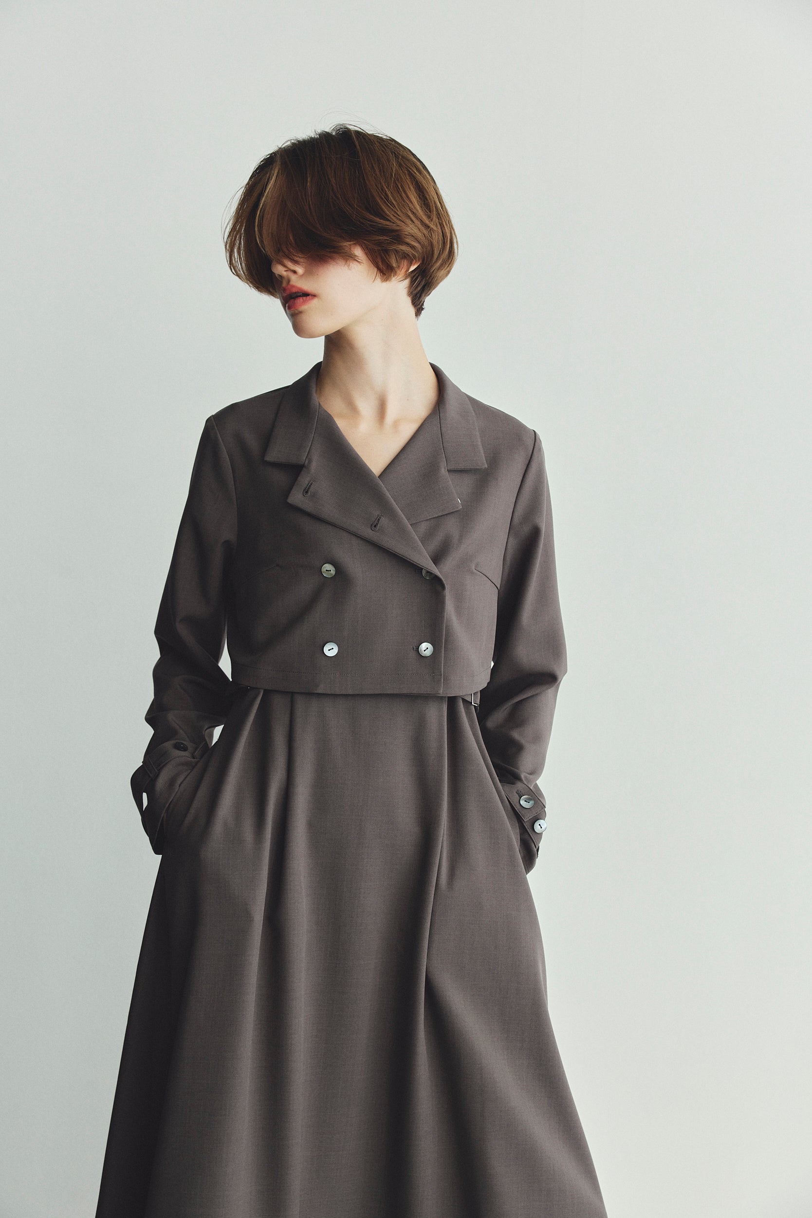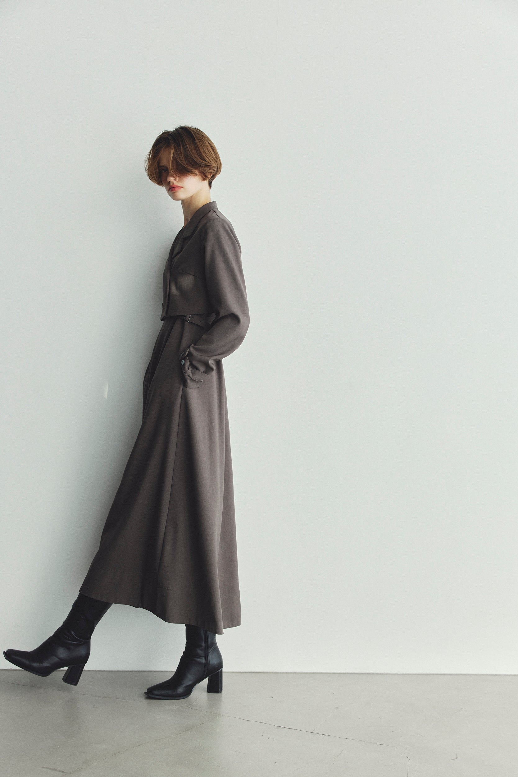 ワンピース:ウエスト脇のベルトでお好みのシェイプラインに調節可能です。また、裾に広めの見返しを当てることで、自然な広がりと安心感のあるヘムラインを実現しました。