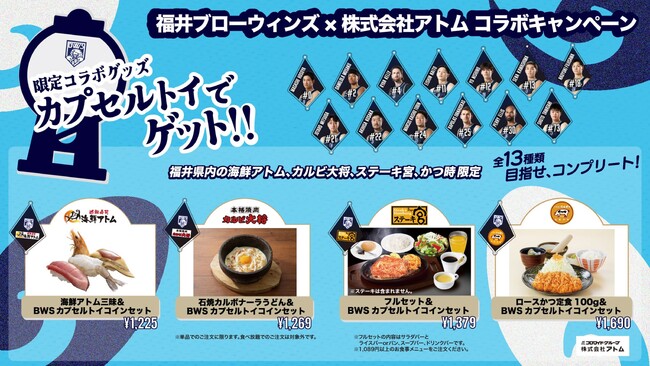株式会社アトムは株式会社福井ブローウィンズとのパートナーシップ契約の締結を記念した企画の第3弾として、対象商品とオリジナルカプセルトイが回せるコインのセットメニューを販売いたします。