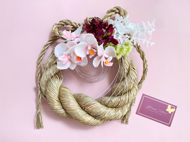 しめ縄作りワークショップでは、高品質なアーティフィシャルフラワーを使用し、お正月が終わったらアーティフィシャルフラワーのスワッグとして、お花の部分は引き続き飾ることも可能なデザインになっています。
