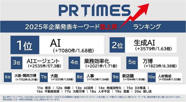 [画像4: https://prcdn.freetls.fastly.net/release_image/112/1603/112-1603-324213479470015d2ac6685fe8e30623-3900x2148.png?width=536&quality=85%2C75&format=jpeg&auto=webp&fit=bounds&bg-color=fff ]上半期の発表の勢いのまま、2023年以降の上昇傾向がありながら、「AI」は急上昇ワードとして前年比1.68倍のランキング1位となりました。急上昇ランキングでは、2位「生成AI」が前年比+3579件(1.63倍)、3位「AIエージェント」が前年比+2535件(57.3倍)と上半期と同じ並びであるもののさらにその上昇傾向を増しています。
