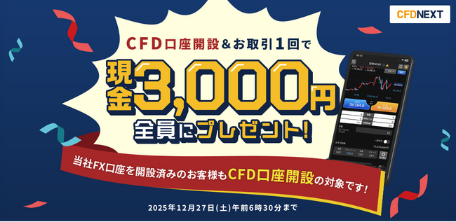 株式会社外為どっとコム(本社:東京都港区、代表取締役社長:竹内 淳)は、『CFDネクスト』におきまして、2025年12月1日(月)より「口座開設&お取引1回でもれなく現金3,000円をプレゼント!キャンペーン」を実施します。