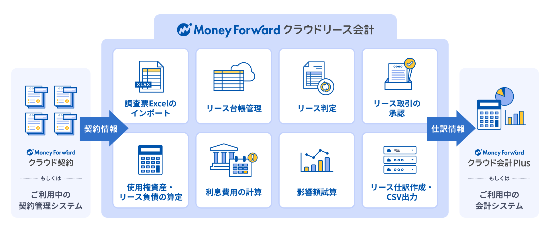『マネーフォワード クラウドリース会計』は、『マネーフォワード クラウド会計Plus』や『マネーフォワード クラウド契約』などとのAPI連携を予定しており、新リース会計基準へのスムーズな移行を可能にします。