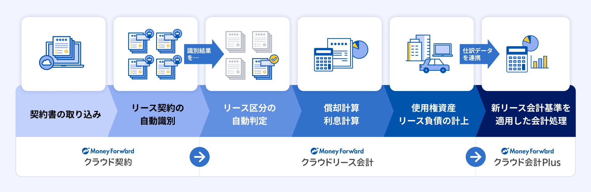 特に、『マネーフォワード クラウド契約』で取り込んだ契約書は、リース契約の識別を経て、『マネーフォワード クラウドリース会計』で判定・償却計算・負債計上まで行います。最終的に仕訳データを『マネーフォワード クラウド会計Plus』に連携することで、新リース会計基準を適用した会計処理をワンストップで実現します。