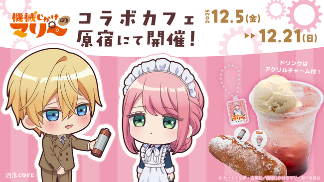 Anique株式会社(本社:東京都千代田区、代表取締役:笠井高秀)は、TVアニメ『機械じかけのマリー』のコラボカフェを、2025年12月5日(金)より東急プラザ原宿ハラカド6Fの洒落CAFE ハラカド店にて開催いたします。新規オリジナルグッズをカフェ店頭と同社が運営するサービスAniqueショップにて販売いたします。[画像2: https://prcdn.freetls.fastly.net/release_image/48489/230/48489-230-dd87bc131e0bb7887a1265693fb1af4c-1909x2700.png?width=536&quality=85%2C75&format=jpeg&auto=webp&fit=bounds&bg-color=fff ]