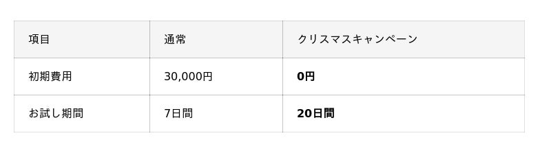 - 【クロスマ】クリスマスキャンペーン!初期費用無料+お試し20日間キャンペーン実施11/28 17:00