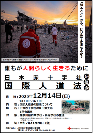 日本赤十字社神奈川県支部は、国際人道法研修会を12月14日(日)に開催します。本研修会では、中学生・高校生を対象に、戦争や平和そして人の命や尊厳について、国際人道法の視点からわかりやすくお伝えします。講師は、神奈川県赤十字国際奉仕団員と赤十字国際委員会(ICRC)の職員が務めます。
