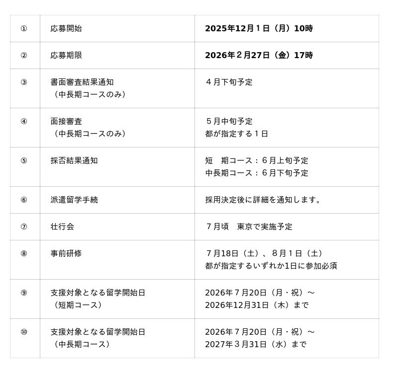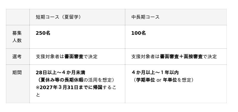 - 短期と中長期2つのコースを設け、留学経験がない若者が挑戦しやすいよう、短期留学向けの募集枠(春夏合わせて年間500名)を手厚く設定