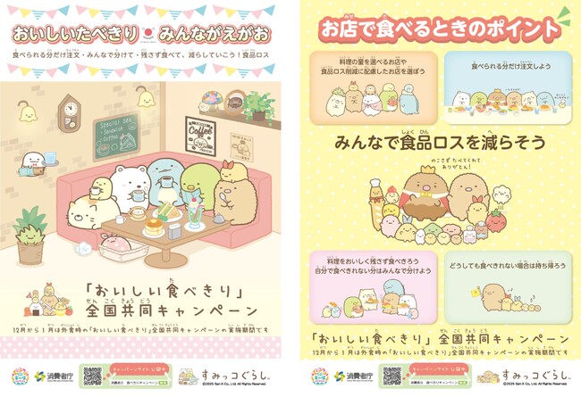 サンエックス株式会社(本社:東京都千代田区)は、12月1日(月)より消費者庁が農林水産省、環境省及び全国おいしい食べきり運動ネットワーク協議会と連携して実施する、外食時の「おいしい食べきり」全国共同キャンペーンに「すみっコぐらし」が登場することをお知らせします。