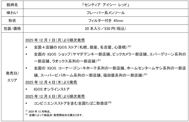 フィリップ モリス ジャパン合同会社(本社:東京都千代田区、社長:シェリー・ゴー、以下「PMJ」)は、加熱式たばこ IQOS ILUMA i(イルマ アイ)およびIQOS ILUMA(イルマ)専用たばこスティック「SENTIA(センティア)」から「センティア アイシー レッド」を、2025年12月1日(月)より、全国4店舗のIQOSストア※1、IQOSショップ(ヤマダデンキ一部店舗、ビックカメラ一部店舗他)、IQOSコーナー(ドン・キホーテ系列の一部店舗他)で、2025年12月4日(木)より、IQOSオンラインストアにて、2025年12月8日(月)より、コンビニエンスストアを含む全国のたばこ取扱店※2にて順次発売いたします。