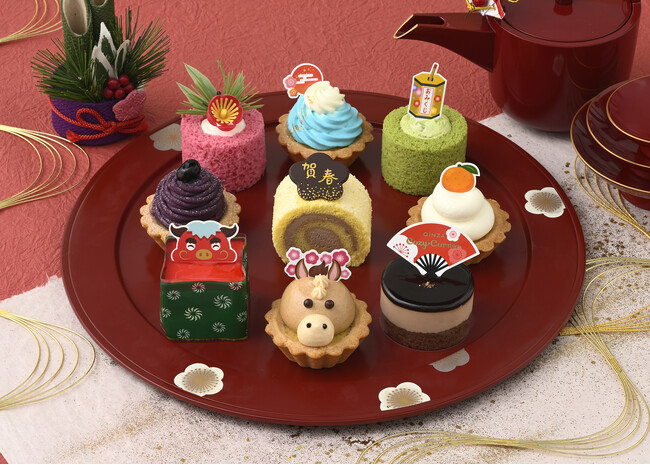 干支の”午(うま)”や初日の出をモチーフにしたタルト、おみくじ付きピックを飾ったロールケーキなど、9種のプチケーキをおせちのお重をイメージしたボックスに詰め合わせました。おせち料理のあとはスイーツを食べて、にっこり笑顔で新たな年をお迎えください。