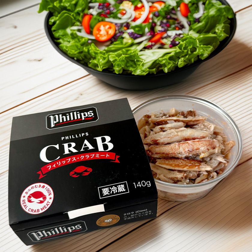 カニの殻を取り除いた「むき身」や「ほぐし身」を指す言葉で、アメリカではレストランや家庭料理で幅広く使用されています。フィリップス・クラブミート・クロウは、その中でもカニの爪および脚の部分のカニ身のみを選別したもので、しっかりとした食感とカニの旨みが特長です。
