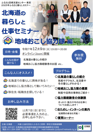 北海道の暮らしと仕事セミナー【地域おこし協力隊編】を12月9日(火)に開催します!