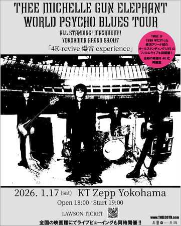 更に、KT Zepp YokohamaでのFILM LIVEの熱気をリアルタイムで楽しめる「THEE MICHELLE GUN ELEPHANT WORLD PSYCHO BLUES TOUR YOKOHAMA ARENA 99.01.17 <revive experience viewing>」が、ライブビューイング オシビューにて全国の映画館で同時上映されることも発表された。