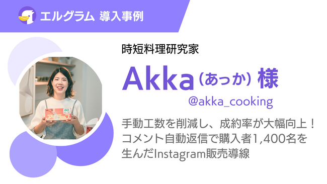 時短料理研究家Akka氏が語るInstagram自動化ツール「エルグラム」活用術。手動DM作業から解放され、時短レシピ販売で購入者1,400名、新規フォロワー4,000人増を達成した具体策をご紹介。