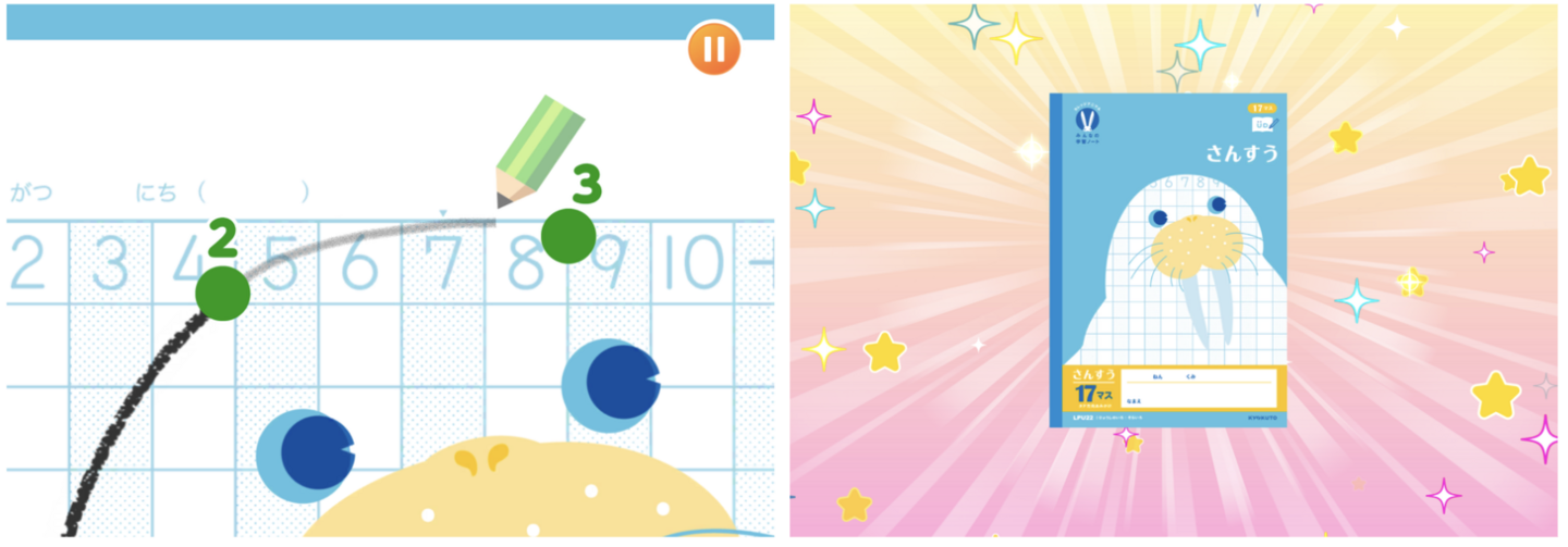 画面に表示された点と点を数字の順番通りに繋いでいく点つなぎゲームです。全ての点を繋げると、動物の絵が完成し、ノートの表紙に現れます。この遊びを通じ、数字の順序を学ぶことができ、どんな動物ができるかを想像しながら楽しむ体験ができます。ネコ、イルカ、ウサギ、パンダなど様々な動物が登場するステージは全部で24種類あり、クリアするごとに次のステージが開放されます。クリア条件に制限時間や評価がないため、未就学児にも楽しく安心して遊んでいただけます。