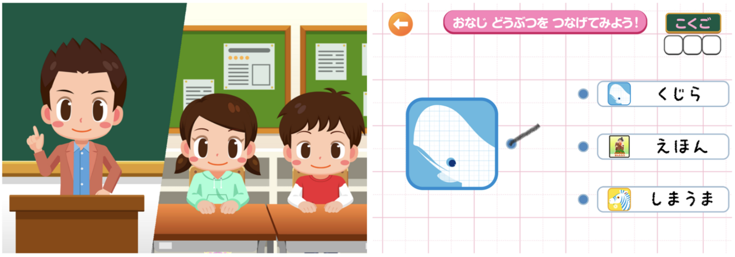 小学校の授業体験ができるゲームです。先生の指示に合った科目のノートを机の中から選び、科目ごとのクイズに挑戦します。科目は、国語・算数・英語の3つがあり、遊ぶたびにローテーションで出題されます。例えば、国語では、「おなじどうぶつをつなげてみよう!」といった課題に、点と点を繋いで正しいものを選択します。この体験を通じて、未就学児が小学校の「授業」を身近に感じ、小学生になったらカレッジアニマル学習帳のノートを使ってみたい!という学習への期待感が膨らみます。