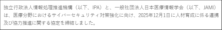 2025年12月1日に、IPAとJAMIは、医療分野におけるセキュリティ人材育成に係る連携と協力を推進するため、協定を締結しました。