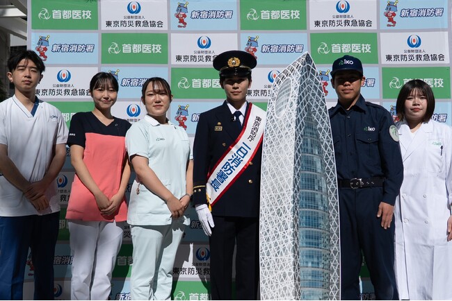 医療の資格取得から就職、給与までを保証する医療・福祉・スポーツの専門学校「首都医校」は、2025年11月7日、東京消防庁の「秋の火災予防運動」に協力し、一日消防署長を務めた俳優の鈴木福さんらとともに、総合校舎コクーンタワーにて防災訓練を実施しました。