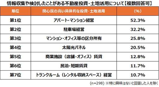 次いで、「駐車場経営」(32.2%)や「マンション・オフィス等の区分所有」(25.8%)といった、比較的初期投資を抑えながらも運用がしやすいタイプの投資が続きました。特に都心部や駅近エリアでは、駐車場経営への注目が高まっている点も示唆されます。