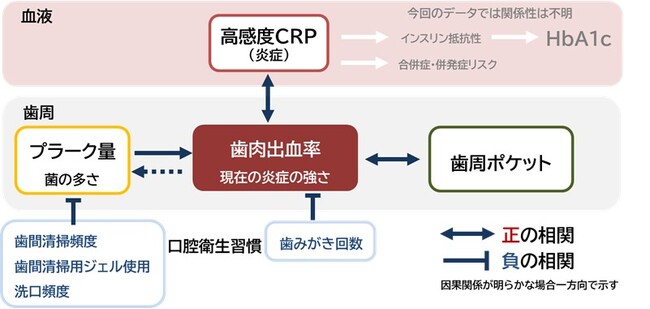 今回の対象データからはHbA1cと口腔指標、高感度CRPとの相関関係はみられませんでしたが、歯肉出血率が、高感度CRPやその他の口腔指標、歯みがき回数と関連し、それらをつなぐ重要な指標であることが示唆されました。また、オーラルケア製品を使った歯間清掃や洗口といった歯みがきに加えて行う口腔衛生習慣がプラーク量の少なさと相関することも示されました。