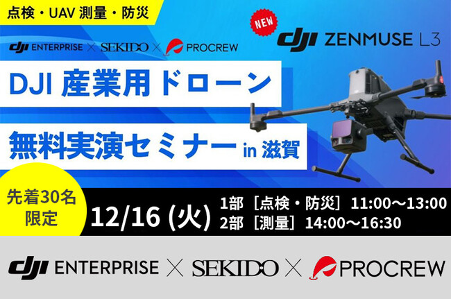 DJI(ディージェイアイ)正規販売代理店としてドローンビジネスの最先端を支える株式会社セキド(本社:東京都港区、代表取締役:大下貴之)は、株式会社プロクルー(本社:滋賀県長浜市、代表取締役:酒井正裕)と共催で、2025年12月16日(火)に滋賀県米原市で「産業用ドローン 点検/防災/ICT施工/測量 無料実演セミナー」を開催いたします。