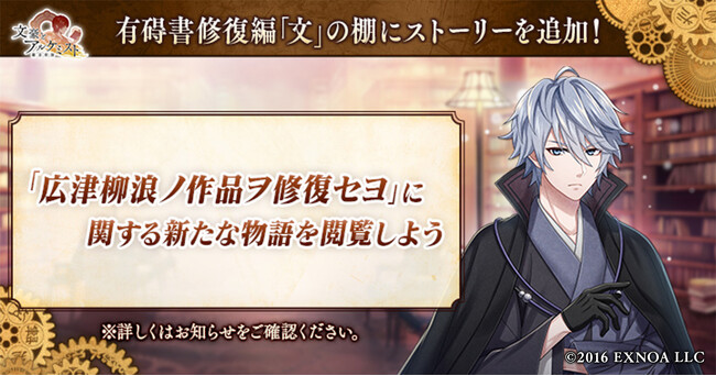 合同会社EXNOA(本社:東京都港区、CEO:東條 寛、URL:https://games.dmm.com/)が運営するDMM GAMESは、12月1日(月)より、女性向け文豪転生シミュレーションゲーム「文豪とアルケミスト」において、「広津柳浪ノ作品ヲ修復セヨ」に関する新たな物語を追加いたしました。