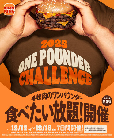 株式会社ビーケージャパンホールディングス(本社:東京都千代田区、代表取締役社長:野村一裕)は、直火焼きの100%ビーフパティの香ばしくジューシーなおいしさを満足いくまでご堪能いただける、ビーフ4枚を使用した“ワンパウンダーシリーズ”の食べたい放題イベント『ワンパウンダーチャレンジ2025』を年3回、2026年1月には「ワンパウンダーチャレンジ2025 ファイナル」を開催いたします。