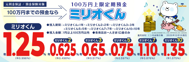株式会社SBJ銀行(本店:東京都港区、代表取締役社長:並木 稔 「以下、当行」)は、お客さまのニーズにお応えするため、本日より、100万円上限定期預金<ミリオくん>につき、下記の通り金利を引き上げいたします。