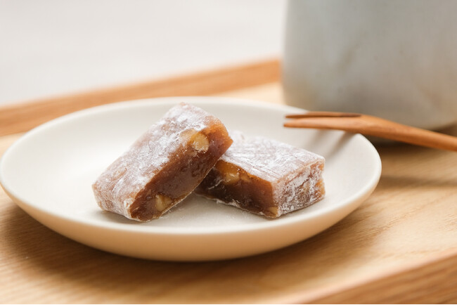 本商品は、たまり醤油でコクを引き出し、黒糖を使わずきび糖で仕上げた、やさしく素朴な甘じょっぱさが特長の和菓子です。濃厚な旨味ととろみのあるたまり醤油を用いることで、噛むほどに香りと甘みがふくらむ深みのある味わいに仕上げました。くるみの香ばしさともっちりした生地の弾力が心地よく重なります。