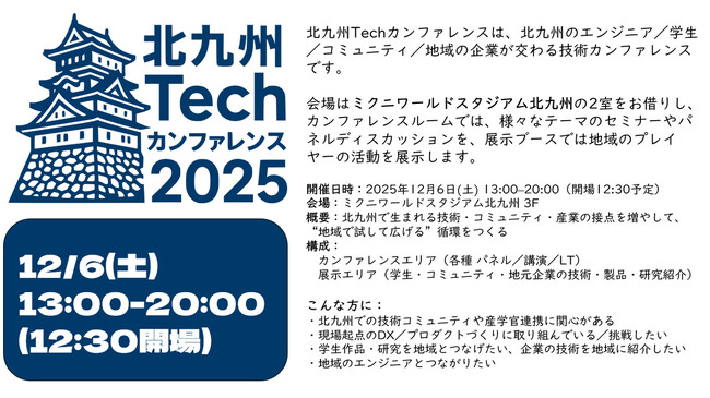 本カンファレンスは、「エンジニアが主役」をテーマに、地域産業とITの融合によるDX推進や、エンジニアコミュニティの活性化を目的としています。当社は、北九州に拠点を持つIT企業としてこの趣旨に賛同し、ブース出展を通じて地域のエンジニアや参加者の皆様との技術的な対話やキャリアに関する情報交換を行います。