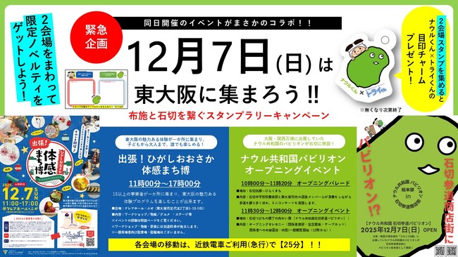 東大阪市内で行われる2つのイベントをハシゴで体験し、大阪・関西万博会場でのワクワク感を再び味わい楽しんでいただきたく、布施と石切を繋ぐこの日限定のスタンプラリーキャンペーンも実施します。