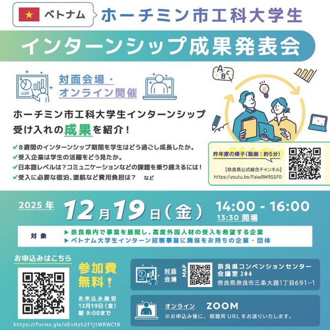 奈良県内で事業を展開し、高度外国人材の受入を希望されている企業の皆様、本事業に興味をお持ちの企業・団体の皆様、インターンシップを通じて成長を遂げられた学生・受入企業の発表を是非お聞きください。