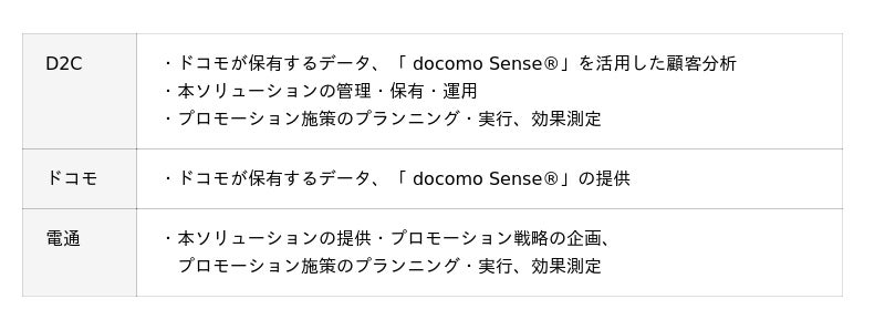 D2C、ドコモ、電通は、本ソリューションの提供を通じて企業のマーケティング課題の解決・価値最大化に寄与します。
