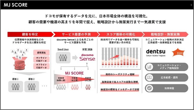 株式会社D2C(以下、D2C)、株式会社NTTドコモ(以下、ドコモ)、株式会社電通(以下、電通)は、企業のプロモーション施策を支援するマーケティングソリューション「MJ SCORE (TM)(Microcosm of Japan SCORE )」(※1)(以下、本ソリューション)を共同開発しました。本ソリューションは、2025年12月3日(水)から電通より提供を開始します。