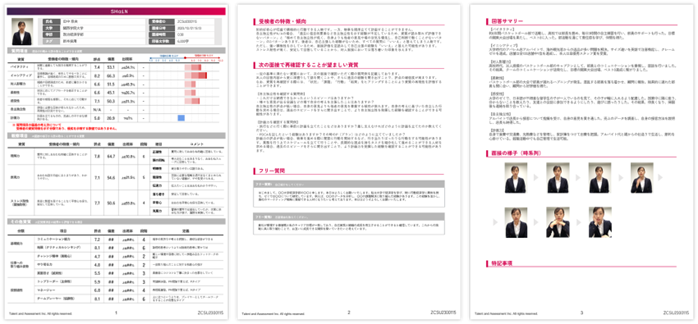 タレントアンドアセスメントが開発した戦略採用メソッドをもとに、受検者はスマートフォンやタブレットを利用し、24時間365日、いつでもどの場所でもAIと対話しながら面接を行うことができ、日程による選考辞退などの機会損失を防ぐことができます。また企業側は面接評価レポートなどを参考に、採用可否だけでなく、対面の面接時には候補者ごとに適した質問の投げかけや、特徴に合わせた動機付けとして活用することができます。