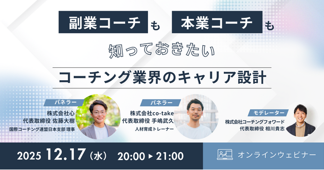 2025年12月17日、株式会社コーチングフォワード(本社:東京都中央区、代表取締役CEO:相川貴志)は、高い成長市場であるコーチング業界でのキャリア設計をテーマにセミナーを開催いたします。