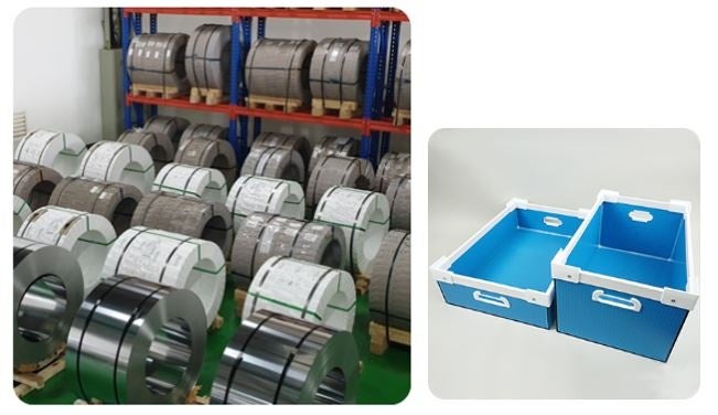 【ステップ3】リサイクル原料を使用し、ステンレス材・樹脂製品生産ステンレス原料は、ステンレスメーカーへ引き渡され、新たなステンレス材に生まれ変わります。PP樹脂(ポリプロピレン)原料は、樹脂製品メーカーへ引き渡され、樹脂製品(当社工場で使用する樹脂製ボックス)に生まれ変わります。