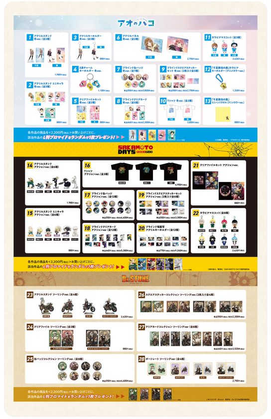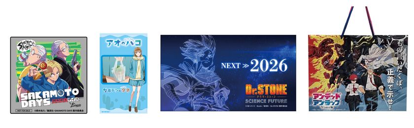 ブース来場者には、トムス/セガ フェイブブース限定のノベルティとして、『SAKAMOTO DAYS』JF2026限定缶バッジ、『アオのハコ』サボテンの種、『Dr.STONE』ステッカー、『アンデッドアンラック』大型ショッパーをそれぞれプレゼントいたします。